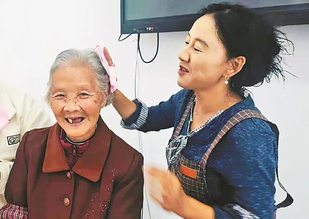 老人戴上发夹,喜笑颜开