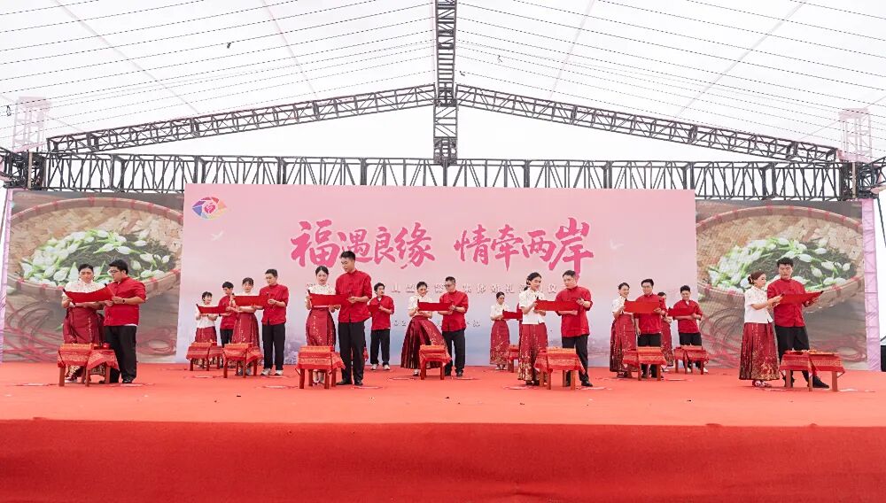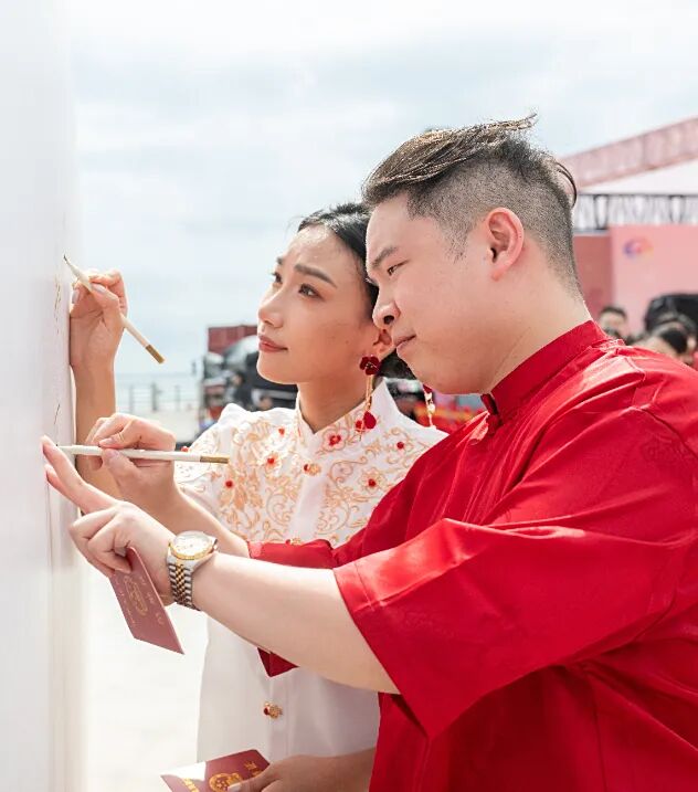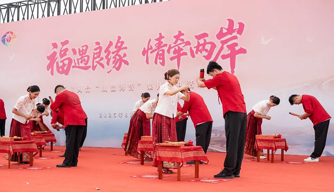山海为媒,礼乐为证。在婚礼仪式上,新人行沃盥礼,净手、拭手,开启新的生活篇章;随后行合卺礼,两岸新人举杯,共饮平潭君山泉水冲泡的茶汤,茶汤融合了福州茉莉花茶的温婉和台湾阿里山茶的香醇,这是对“闽台一衣带水、文化一脉相承”的生动诠释,也象征着新人从此“同心同源、相守相伴”。“喜今日赤绳系定,珠联璧合;卜他年白头永偕,桂馥兰馨……”在司仪的引导下,新人宣读婚书并签字,一笔一划间,是对彼此一生的约定,也是闽台缘分的鲜活印记。最后,新人行鞠躬礼,一谢天地,见证山海之盟,二谢宾客,同庆良辰美景,三谢爱人,惟愿相伴一生,全场掌声雷。至此,仪式圆满礼成。