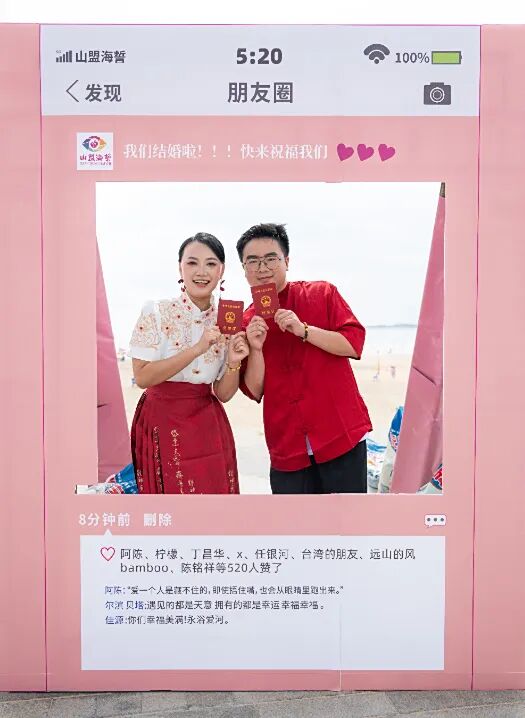 8月30日,第三届闽台“山盟海誓”集体婚礼在平潭综合实验区龙王头海洋公园举办。现场,11对闽台新人携手共赴一场跨越山海之约,用爱谱写两岸同胞“同心同源、喜结连理”的美好篇章。