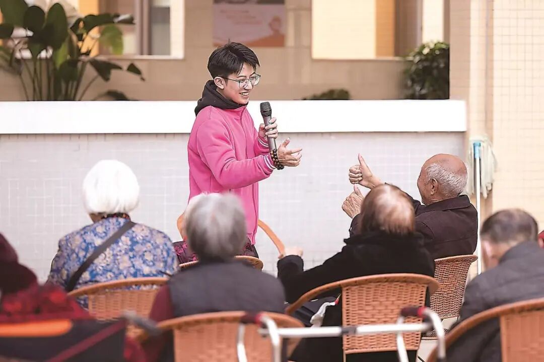 2004年出生的王子昊是院里最年轻的职工,他总能把半小时晨练变得格外生动。带领老人做完基础运动后,他拿起话筒唱起闽南语老歌,老人挥舞双手、高声喝彩,没牙的笑容格外真挚,晨练时光也总在欢声笑语中悄悄延长。