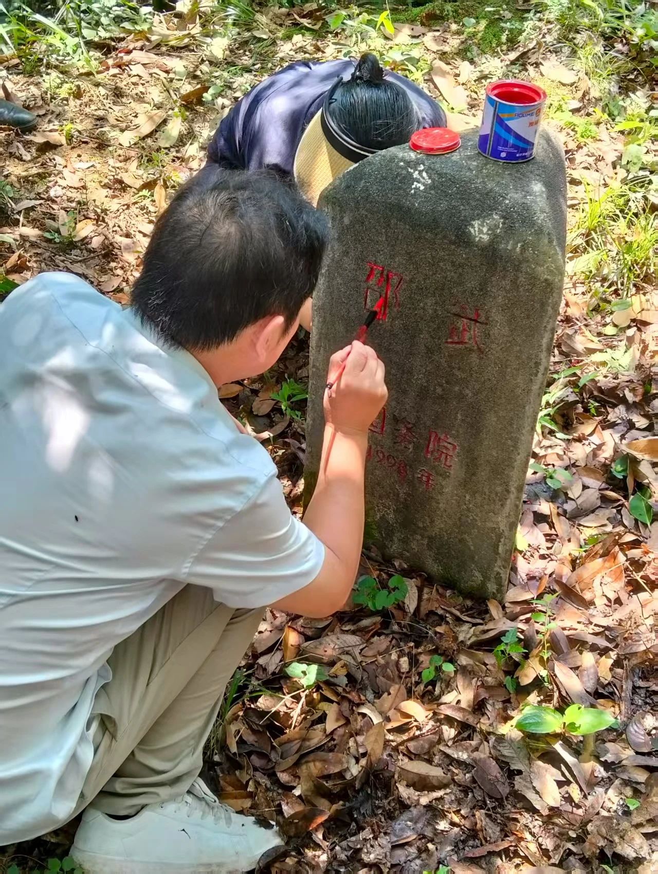 联检人员对界桩周围杂草等遮挡物进行清除,对字迹模糊不清的界桩进行现场清洗描红,并逐点核对埋设的8个界桩位置是否准确、标识是否清晰、桩体是否完好,详细记录沿线地形地貌变化,并就界线走向与毗邻乡镇现场确认。同时,通过走访沿线居民群众及时了解界线、界桩管护及边界平安相关情况,广泛宣传界线联检的重要意义,提高群众对建设平安边界重要性的认识,增强依法守界、护界、治界的自觉性。