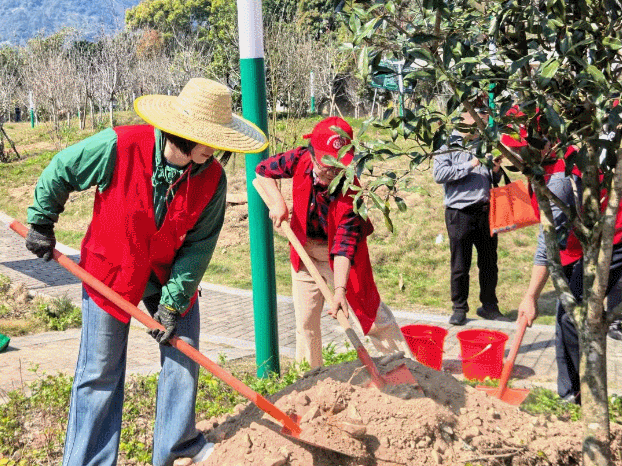 活动现场,志愿者们身着志愿服装,手持铁锹、水桶等工具,分工协作、默契配合。大家挥锹铲土、扶苗稳树、培土围堰、提水浇灌,每一道工序都细致规范、有条不紊,充分发扬“奉献、友爱、互助、进步”的志愿精神。经过一个多小时的辛勤劳作,数十株新苗在春日的田野上迎风挺立,为美丽乡村增添了勃勃生机。志愿者们还为新栽树苗挂上“生态寄语·时光牌”,将福种在永泰的大地上,将爱根植在百姓心里,以“植绿、护绿、爱绿”的实际行动传递生态文明理念。