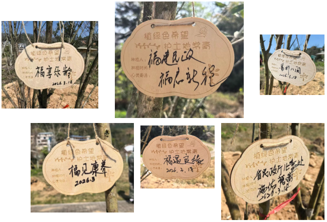 活动现场,志愿者们身着志愿服装,手持铁锹、水桶等工具,分工协作、默契配合。大家挥锹铲土、扶苗稳树、培土围堰、提水浇灌,每一道工序都细致规范、有条不紊,充分发扬“奉献、友爱、互助、进步”的志愿精神。经过一个多小时的辛勤劳作,数十株新苗在春日的田野上迎风挺立,为美丽乡村增添了勃勃生机。志愿者们还为新栽树苗挂上“生态寄语·时光牌”,将福种在永泰的大地上,将爱根植在百姓心里,以“植绿、护绿、爱绿”的实际行动传递生态文明理念。