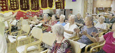 “青青的草原,星星在闪耀,梦中妈妈的脸,在为我挂牵。”7月16日下午,当记者来到台江区上海街道居家社区养老照料中心时,活动区的音响传出优美高亢的歌声,20多位老人正跟着老师的动作、和着旋律拍手,动作舒缓,神情沉醉。