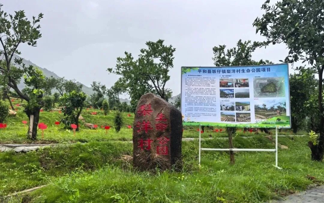 记者站在平和县坂仔镇梨洋村的坡地之上,蜜柚飘香,放眼望去山腰间梨洋村生命公园的碑石格外醒目,墓位巧妙融入山体,逝者与花草树木为伴,生命公园别具韵味。