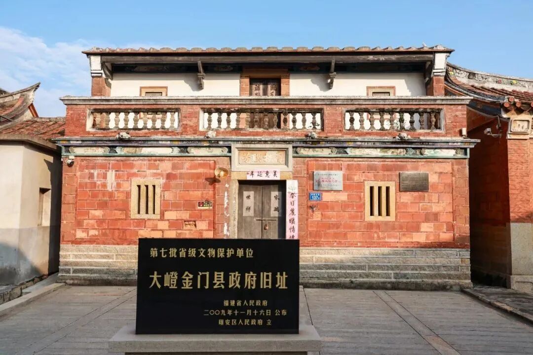 更具意义的是,大嶝郑氏聚落内有12间金门县政府旧址,2009年被列为省级文保单位。1937年10月金门沦陷后,金门县政府迁此领导抗战,八年里九任县长轮替,使其成为两岸共同御侮的见证,大嶝岛也获“抗日圣地”之称。国民党金门县党部旧址(田墘南里351号)为中西合璧红砖洋楼,属第七批省级文保单位,虽经战火仍完好,是两岸抗日的珍贵遗存。