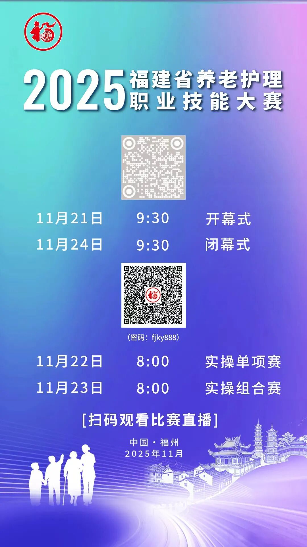 2025年福建省养老护理职业技能大赛开通了线上直播,欢迎扫码观看,一起为养老护理员加油!