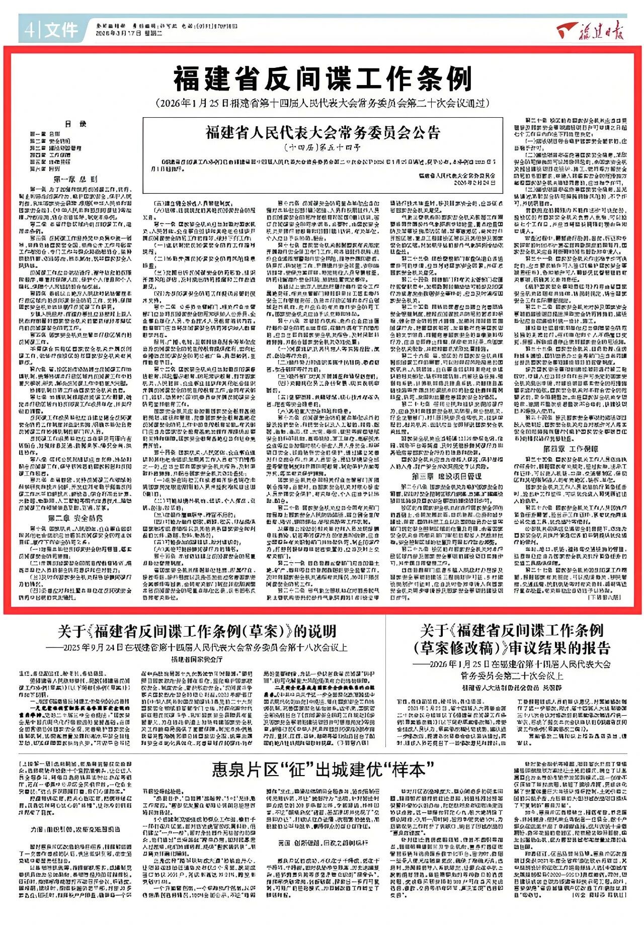 ↑3月17日,福建日报第4版刊登《福建省反间谍工作条例》相关报道