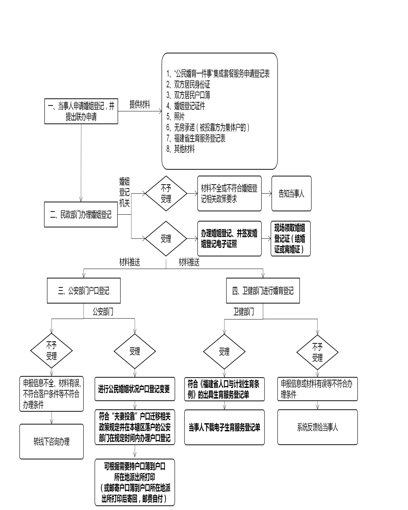 民政部门为符合婚姻登记条件的当事人颁发婚姻登记证件后通过“公民婚育一件事”系统依申请即时推送联办信息。公安部门在收到婚姻登记变更申请信息后,在1个工作日内办理户口登记项目婚姻状况变更,当事人可根据需要持户口簿到户口所在地派出所打印(或邮寄户口簿到户口所在地派出所打印后寄回,邮资自付);收到申请办理夫妻投靠户口迁移的联办信息后,在10个工作日内审核办结,并反馈结果,由系统通知申请人:通过审核的,可根据需要持户口簿到户口所在地派出所打印(或邮寄户口簿到户口所在地派出所打印后寄回,邮资自付);未通过审核的,转线下咨询办理。卫健部门查收并审核相关信息,当事人在审核通过后即可网上下载、打印《福建省生育服务登记表》。