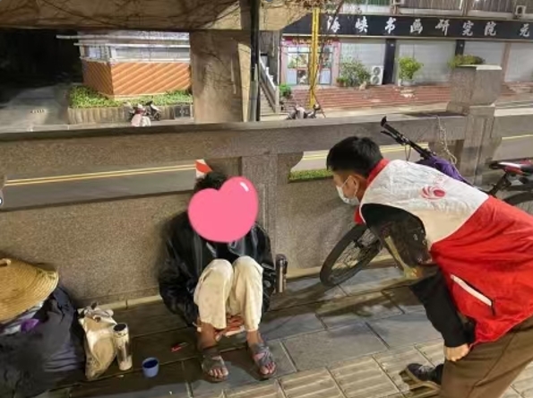 行动中,根据热心市民提供的线索,外展服务队在颖如大桥附近发现一名疑似患有精神疾病的流浪乞讨人员老尤(化名)。在社工的耐心沟通下,了解到老尤是自己从广东独自骑行外出旅行,到安溪后已身无分文,被迫开启流浪生活。外展服务队给老尤提供了水、面包、棉衣后,将他引导至救助管理站。随后,在公安部门的帮助下,救助管理站最终确认了其身份信息并成功寻亲,联系其家人将他平安接回家。