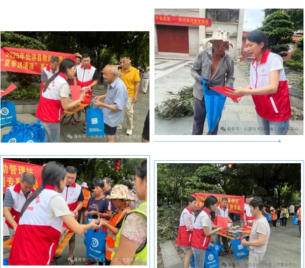 救助站工作人员在仙游县城辖区内的汽车站、公园、八二五大街、桥洞底下等地方,为生活无着的流浪乞讨人员、临时遇困人员等弱势群体提供风油精、绿豆汤、矿泉水、清凉油等解暑物品,为他们送去一份清凉。并组织开展救助政策宣传活动,发放救助政策宣传单,向来往的环卫工人、外卖员和热心市民等分发救助宣传单,普及相关的救助政策、告知救助途径等,扩大社会参与面,确保专项救助行动各项措施落实到位。