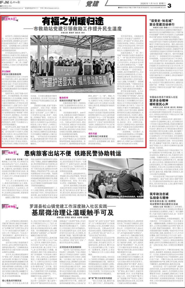 细节彰显城市温度。从为长期滞留人员取名寓意“榕城情深,千里共婵娟”的“林榕娟”,到护送返乡时备足御寒衣物和药品,再到将拾荒老人辛苦积攒的2.8万余元现金分文不差地交回家属手中,党的关怀融入每个细节。“寻亲工作需要长年累月不间断地跟进。部分滞留人员由于智力残疾、精神障碍等原因无法配合或拒绝配合,无法提供有效信息,寻亲陷入僵局。长期努力未果,带给我们难以想象的心理压力,但一想到自己是党员,我还是一次又一次勇往直前。见证亲人团圆是对初心最深刻的洗礼!”市救助站党员翁栩真挚的感悟,道出了一线党员的心声。