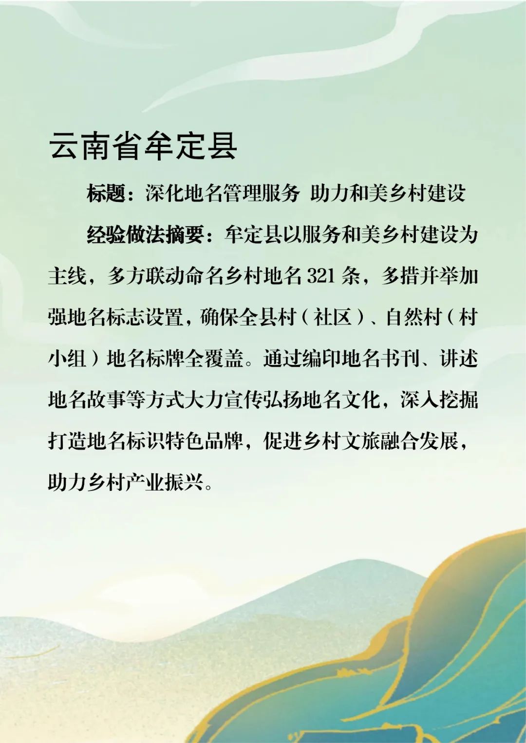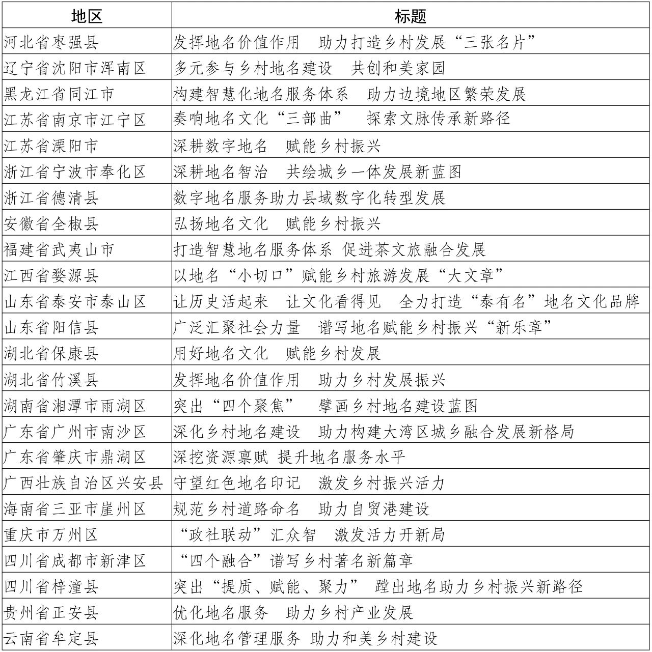 为贯彻落实党中央关于全面推进乡村振兴的战略部署,指导各地深入推进“乡村著名行动”,我部组织开展了“乡村著名行动”典型经验做法征集工作。经过自主申报、省级推荐、专家评审、实地考察等环节,选出河北省枣强县等24个县(市、区)的典型经验做法。现将《“乡村著名行动”第一批典型经验做法摘要》印发给你们。请各地结合实际学习借鉴,持续深入探索加强乡村地名建设、赋能乡村全面振兴的路径模式,全面提升乡村地名管理服务水平,助力宜居宜业和美乡村建设。