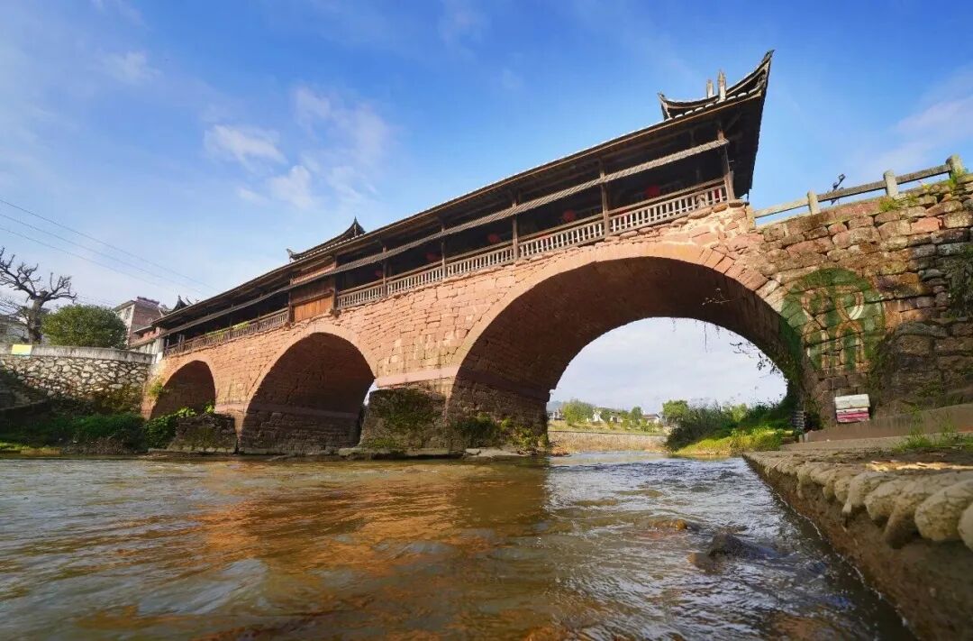 会清桥是贡川的标志性古建筑,集通行、风水、宗教祭祀等功能于一体。桥身始建于明成化乙巳年(1485年),南北走向,两墩三孔,长41米、宽7米、高8.1米,以丹霞石垒砌拱券,最大单拱跨度达13米,是福建省单拱跨度最长的古代廊桥。桥面廊屋建于清顺治元年(1644年),晚于桥身百余年。该桥坐落于胡贡溪与沙溪河交汇处,浊清两水在此交融,“会清”之名,或说取自迎接清朝,或说源于两河交汇之意。